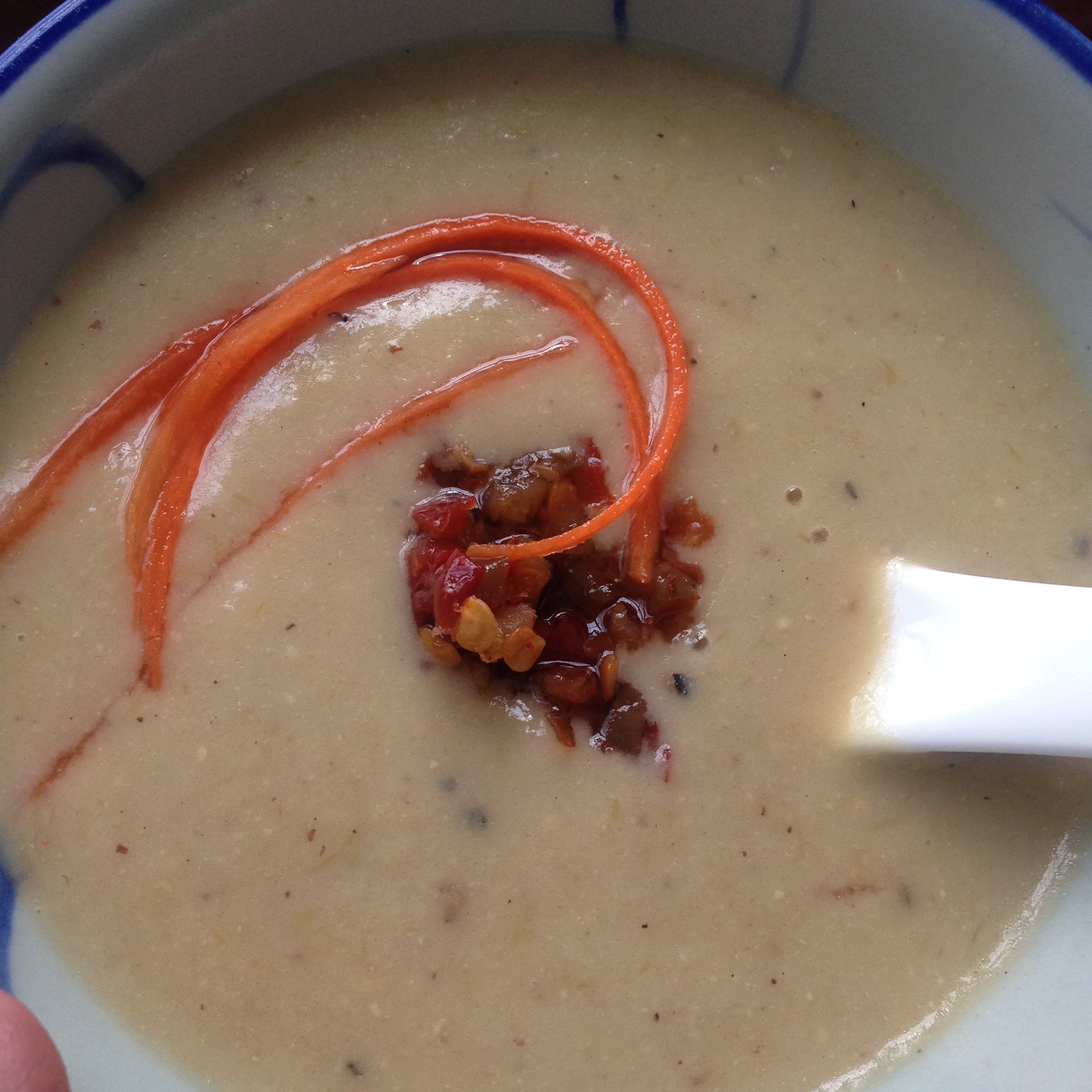 This is relatively complicated soup to prepare, but well worth the effort. It basically consists of three separate procedures : roasting the cauliflower, toasting and grinding the spices, and composing and pureeing the soup. You could just as well serve this soup rustic-style (without pureeing), but I think its’ worth the extra time and energy to puree for a more elegant soup, one that would happily grace the most sophisticated table. The fact that it is so simple, rich and creamy and also vegan may come as a surprise to some–it’s a great dish to introduce to people who may be skeptical about how deep a flavor one can get from healthy, vegetable-based cuisine.